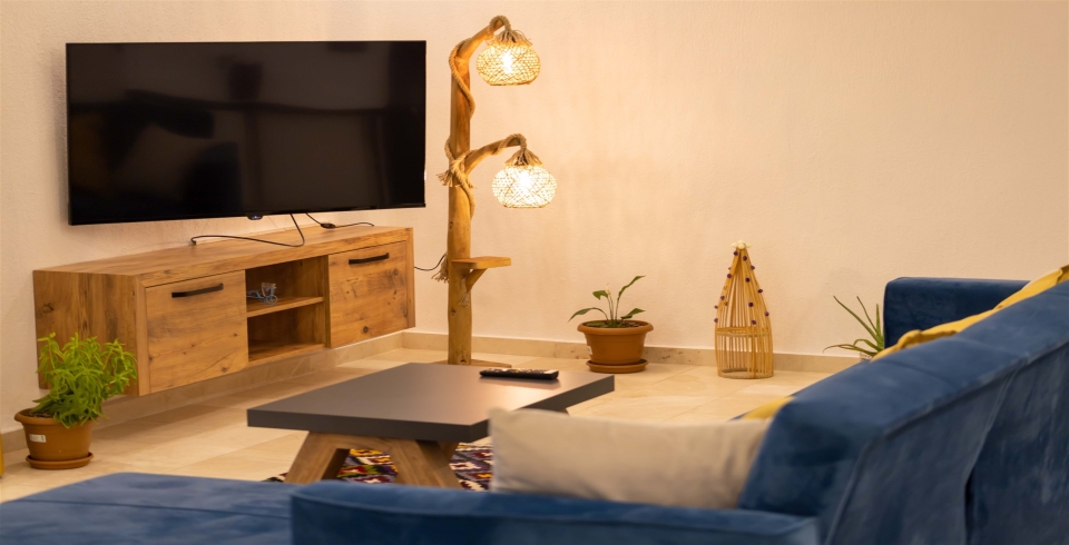 Salon : Oturma grubu, TV, sehpa, Klima, internet.