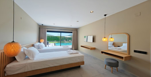 3. Yatak odası: 2 adet tek kişilik yatak, elbise dolabı, komodin, klima, banyo ve tuvalet bulunmaktadır.