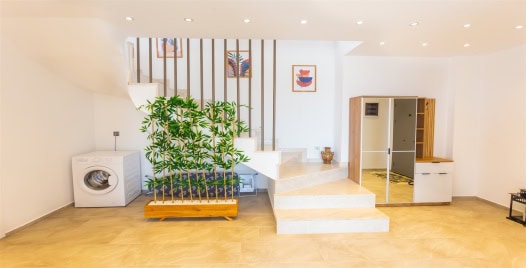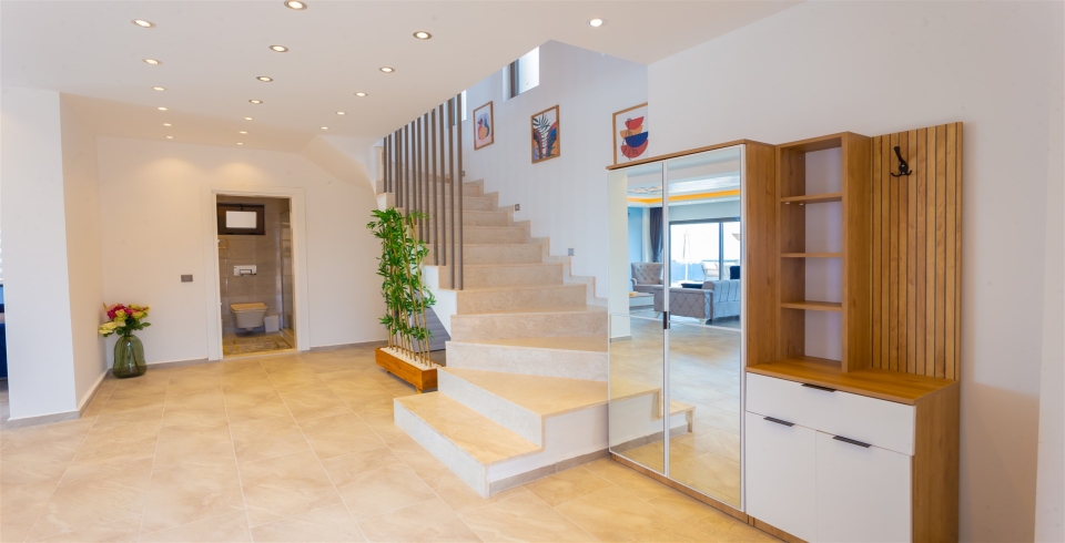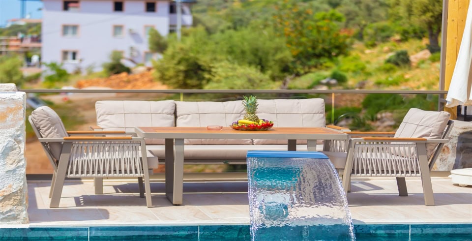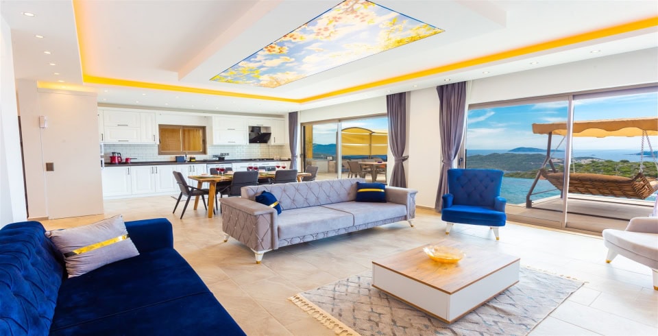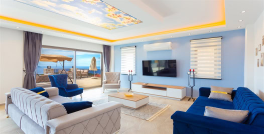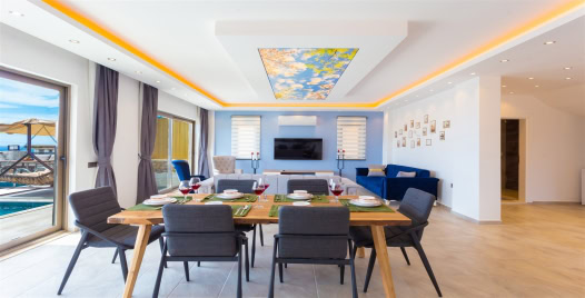 Salon : Villamızın iç dizaynı da son modaya uygun olarak modern bir şekilde tasarlanmıştır. Çeşitli dekoratif eşyalarla süslediğimiz salonumuz havuzlu bahçeye açılıyor. Villa salonunda oturma grubu, TV, internet, klima, sehpa bulunmaktadır.