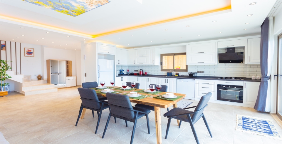 Mutfak : Modern Amerika mutfağımızda yemek masası, buzdolabı, çamaşır makinesi, 4’lü ocak, tost makinesi, elektrikli su ısıtıcısı, kahve makinası, çatal-bıçak takımı, tencere-tava takımı, bulaşık makinesi bulunmaktadır.