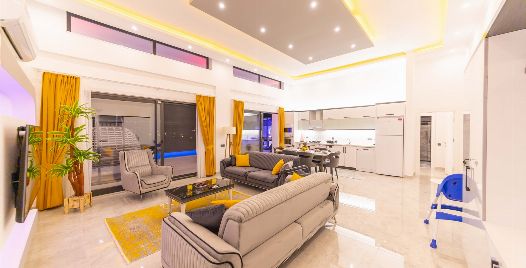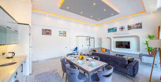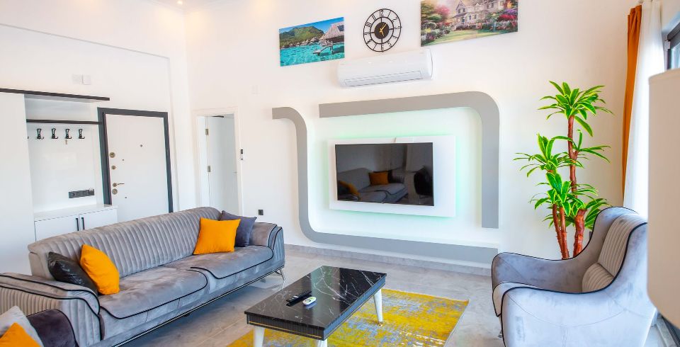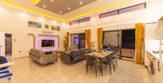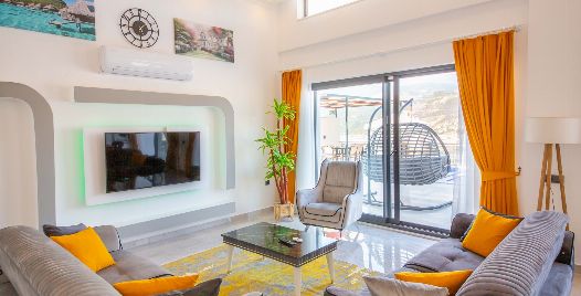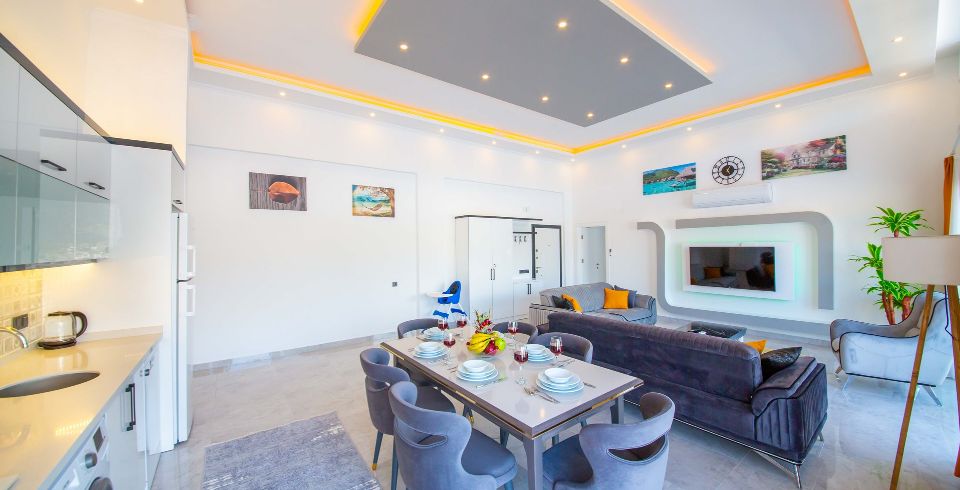 Salon: Villa salonunda konforlu oturma grubu, klima, TV, internet, uydu alıcı, yemek masası, sehpa bulunmaktadır.