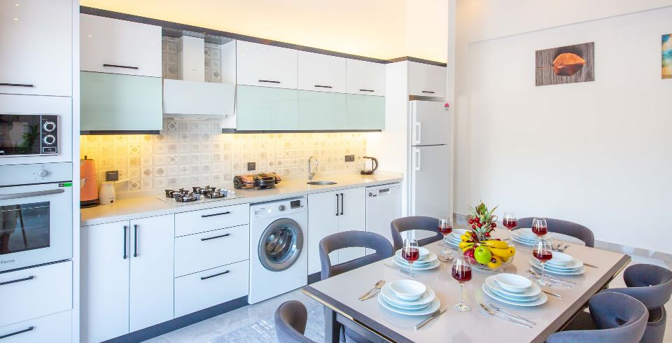 Mutfak: Villamızın mutfağında buzdolabı bulaşık makinası, çamaşır makinası, 4'lü ocak, ketıl, mikro dalga fırın, filtre kahve makinası 4 kişilik yemek takımı bulunmaktadır.