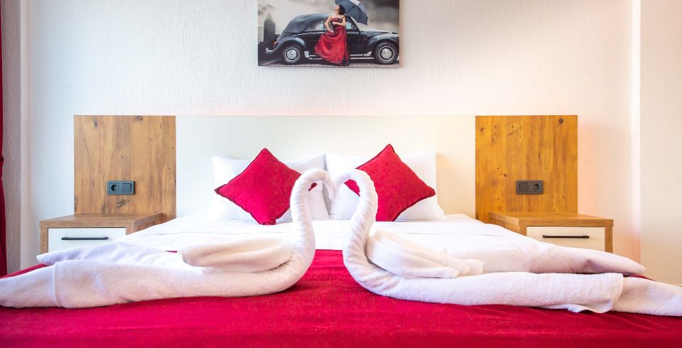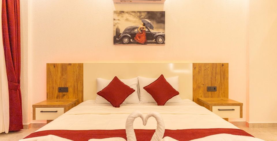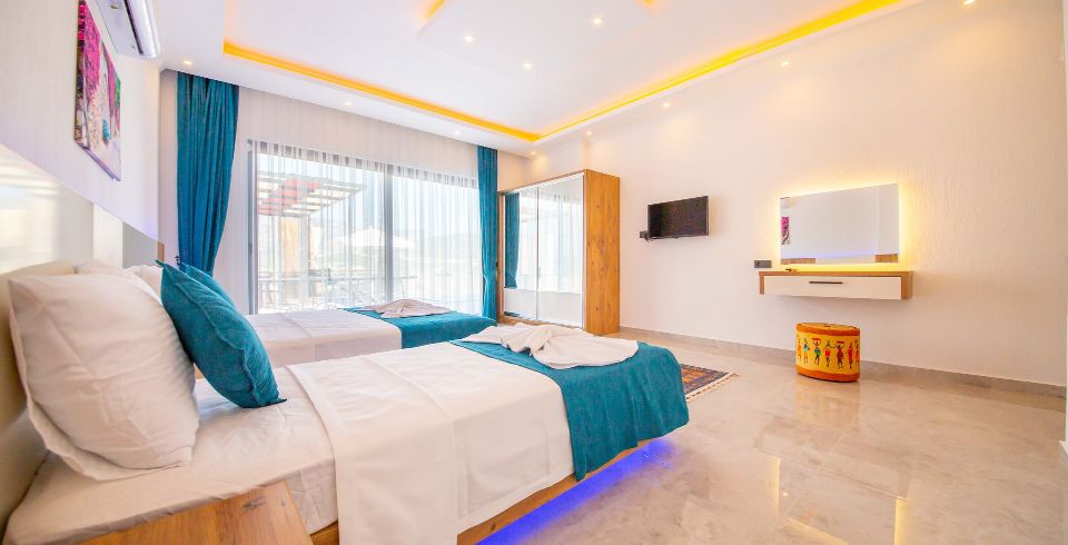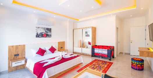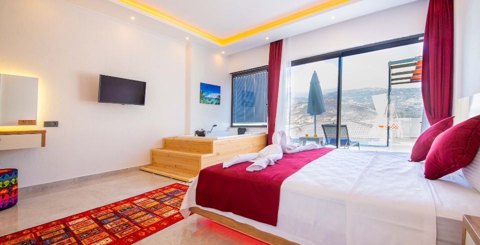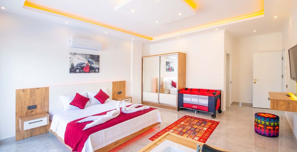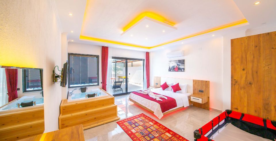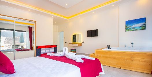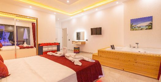 1. Yatak Odası: Çift kişilik yatak, klima, jakuzi, komodin, elbise dolabı, makyaj masası, banyo ve tuvalet bulunmaktadır.