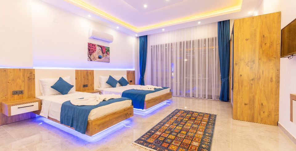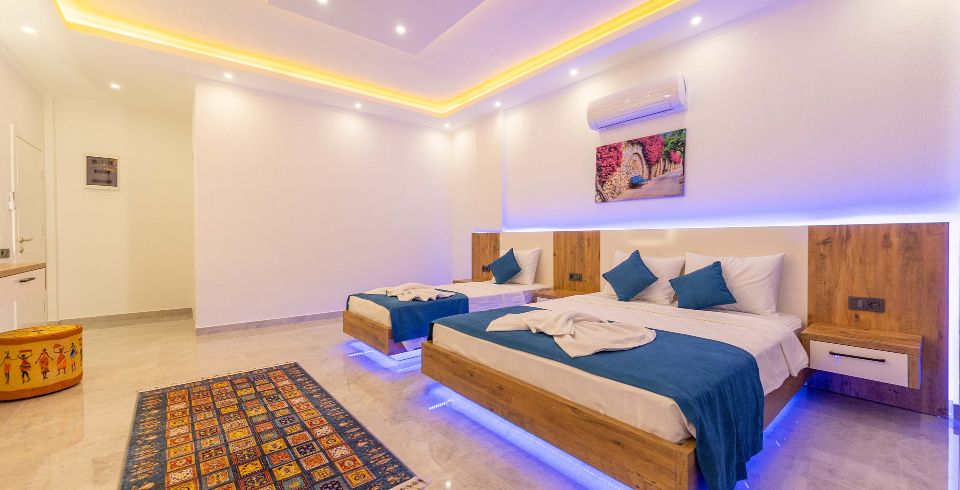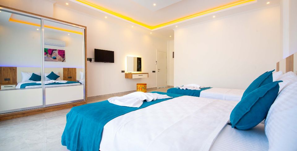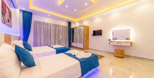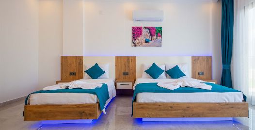 2. Yatak Odası: 1 adet çift kişilik 2 adet tek kişilik yatak, klima, komodin, elbise dolabı, makyaj masası banyo ve tuvalet bulunmaktadır.