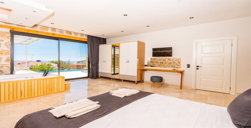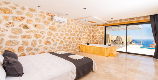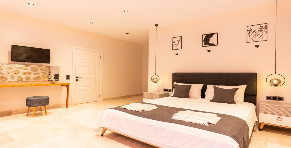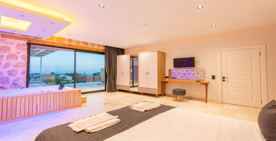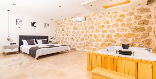 Yatak Odası : 1 adet çift kişilik yatak, klima, elbise dolabı, makyaj masası, komodin, jakuzi, banyo ve lavabo bulunmaktadır.