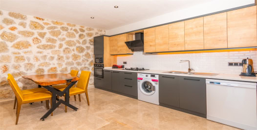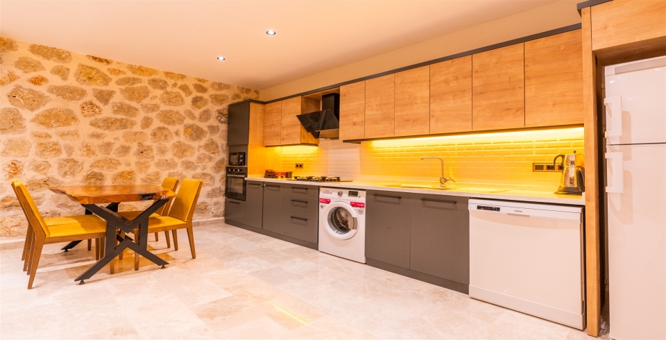 Mutfak : Buzdolabı, bulaşık makinası, çamaşır makinası, kettle, kahve makinası, fırın, mikrodalga fırın, ocak, yemek masası, yemek takımları, tencere tava takımları, çaydanlık bulunmaktadır.