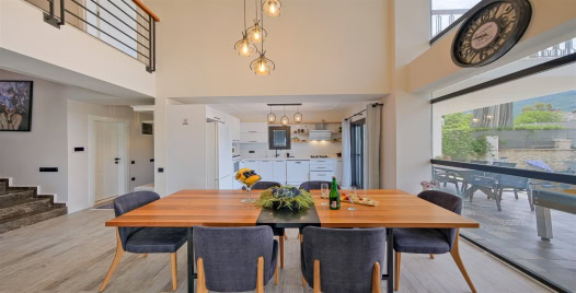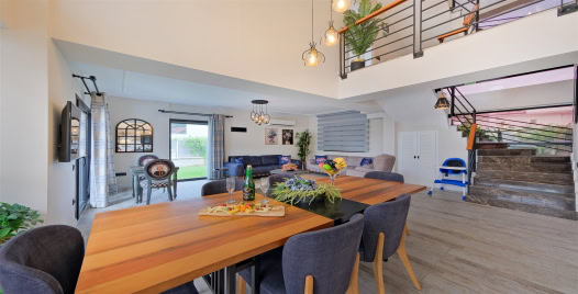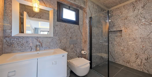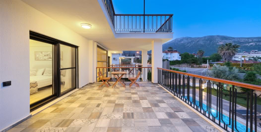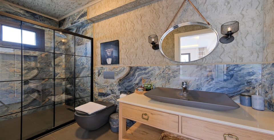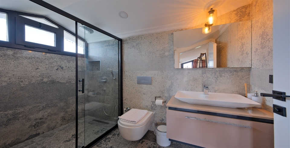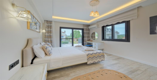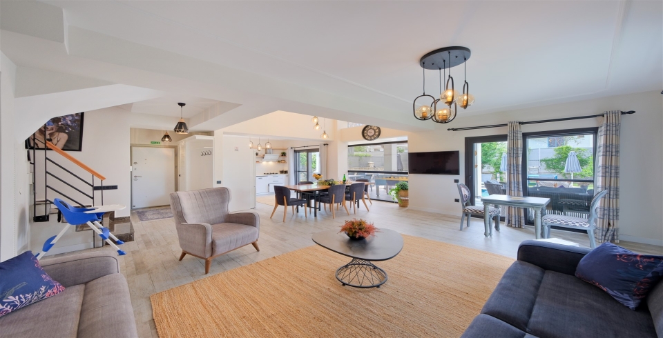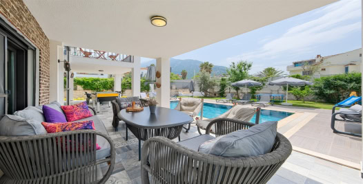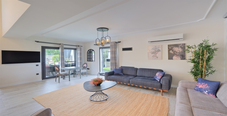 Salon : Konforlu oturma grubu, LCD TV, klima ve wi-fi modem, uydu sistemi mevcuttur. Havuz terasına çıkış bulunmaktadır.