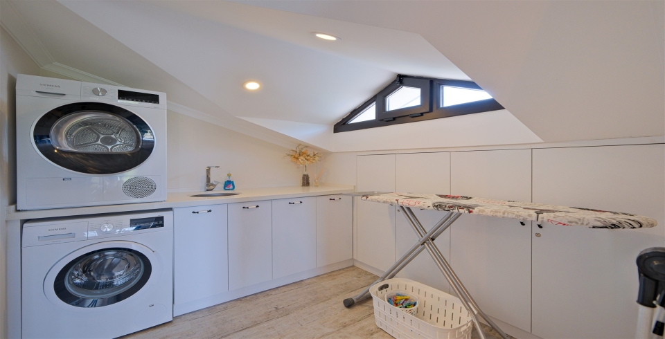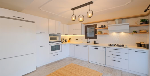 Mutfak : Amerikan mutfak tarzında tasarlanmış mutfakta, yemek masası sandalyeler, buzdolabı, bulaşık makinesi, çamaşır makinesi, 4’lü ocak, mikrodalga fırın, ankastre, fırın, kettle, su sebili, yemek takımı, tencere vb. mutfak ekipmanları mevcuttur.