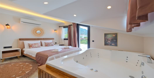 1. Yatak Odası : Çift kişilik yatak, komodin, elbise dolabı, klima, jakuzi bulunmaktadır.