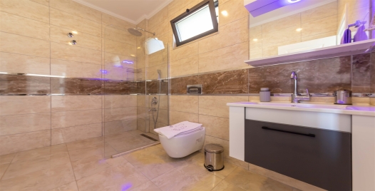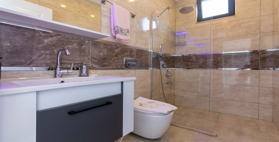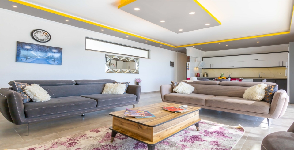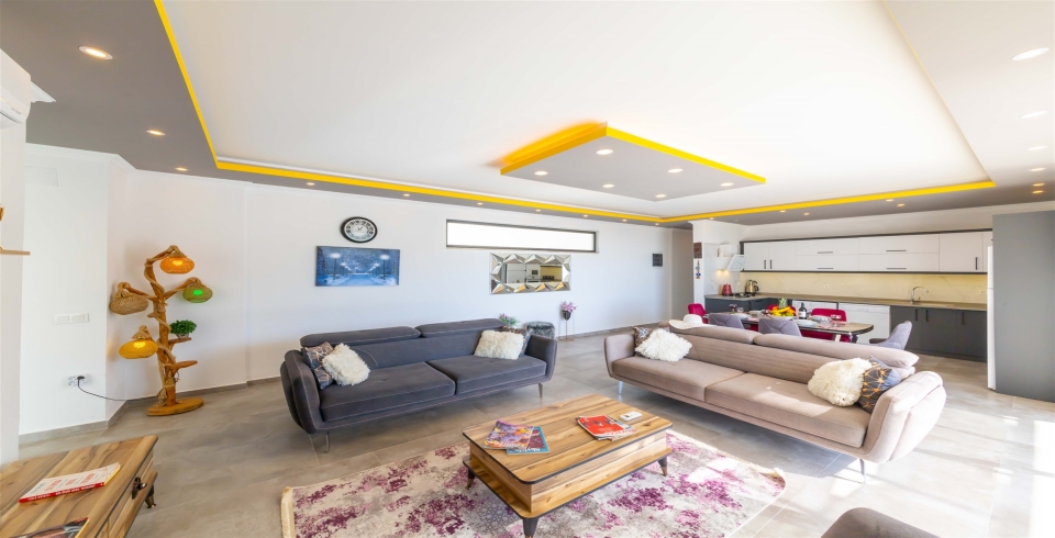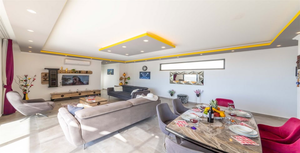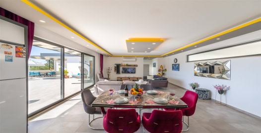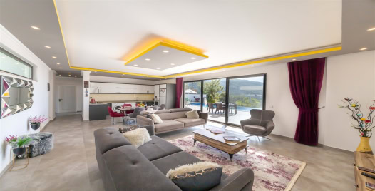 Salon : Villamızın iç dizaynı da son modaya uygun olarak modern bir şekilde tasarlanmıştır. Çeşitli dekoratif eşyalarla süslediğimiz salonumuz havuzlu bahçeye açılıyor. Villa salonunda oturma grubu, TV, internet, klima, sehpa bulunmaktadır.