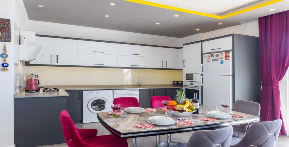 Mutfak : Modern Amerika mutfağımızda yemek masası, buzdolabı, çamaşır makinesi, mikrodalga fırın, 4’lü ocak, elektrikli su ısıtıcısı, çatal-bıçak takımı, tencere-tava takımı, bulaşık makinesi bulunmaktadır.