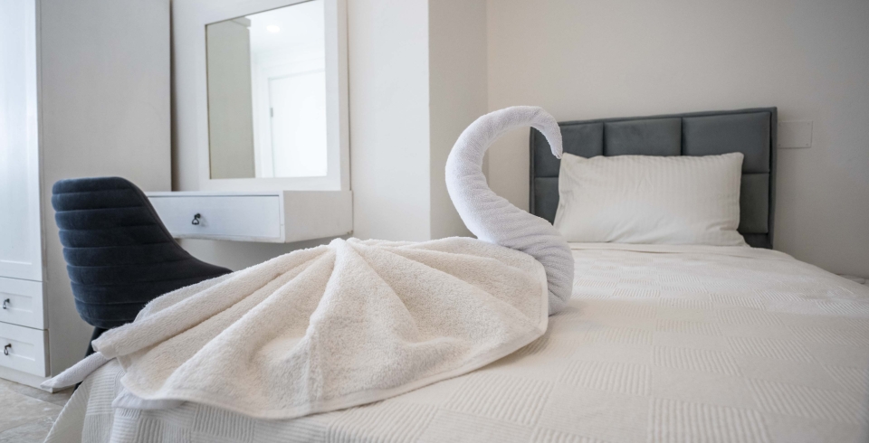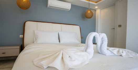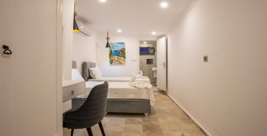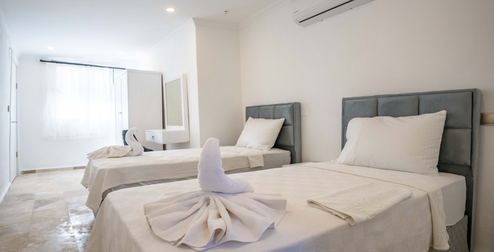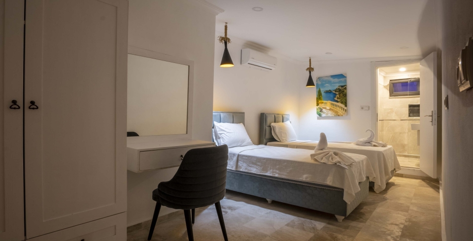 2. Yatak Odası : 2 adet tek kişilik yatak, elbise dolabı, komodin, makyaj masası, klima, banyo ve tuvalet bulunmaktadır.