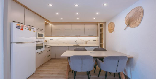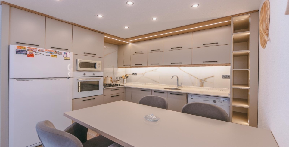 Mutfak : Modern amerikan mutfak içerisinde buzdolabı, bulaşık makinesi, çamaşır makinesi, yemek takımı, çatal-bıçak seti, tencere, tava, bardak ve diğer mutfak ekipmanları yer almaktadır.