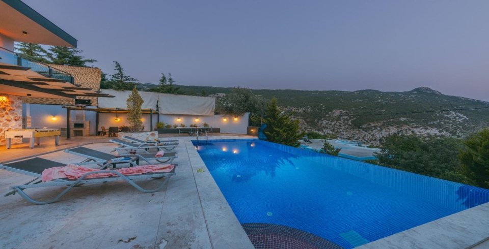 Havuz Ve Bahçe : Villamızın havuzu korunaklı olup dışarıdan gözükmemektedir.Havuz terasında şezlong , şemsiye,salıncak,langırt,masa tenisi ,oturma grubu ve barbekü bulunmaktadır.