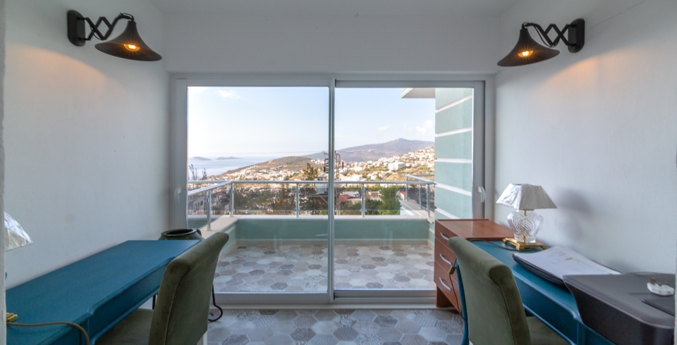 Villanın ferah salonu, deniz manzarasına açılan geniş cam kapılarıyla doğal ışığı içeri alır. Rahat oturma grubu, klima, uydu TV ve kablosuz internet bağlantısı konforlu bir alan oluşturur. Tam donanımlı mutfak bölümünde bulaşık makinesi, fırın, mikrodalga, buzdolabı, çay-kahve makinesi ve 8 kişilik yemek masası bulunmaktadır. Misafirler dilerse iç mekanda, dilerse terasta keyifli akşam yemekleri hazırlayabilir.