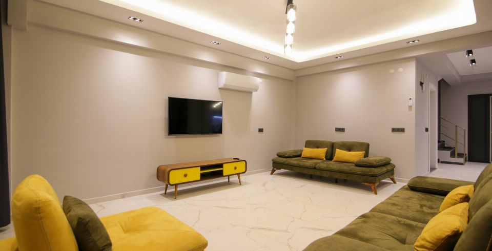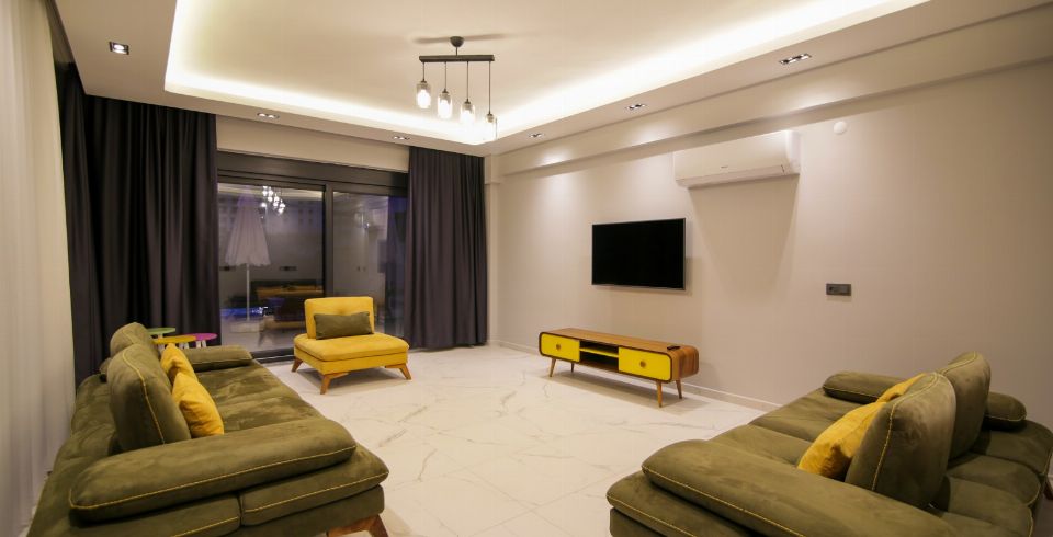 Salon: Villa salonunda konforlu oturma grubu, klima, TV, internet, uydu alıcı, yemek masası, sehpa bulunmaktadır.