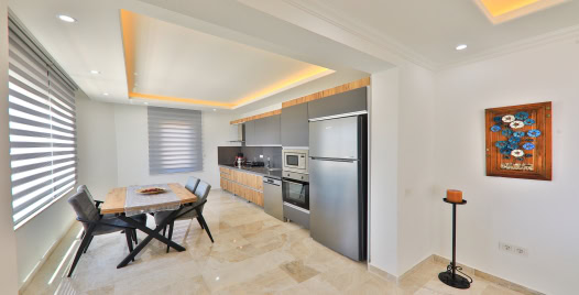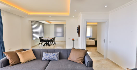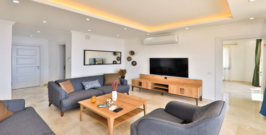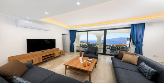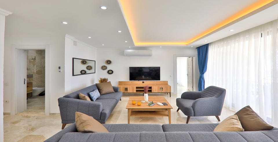 Salon: Özenle döşenmiş salon, modern koltuklar, 10 kişilik yemek masası, LCD TV ve klima bulunmaktadır.