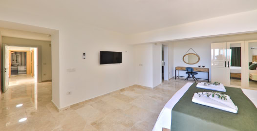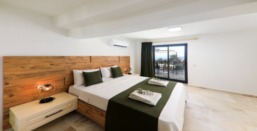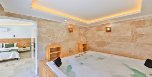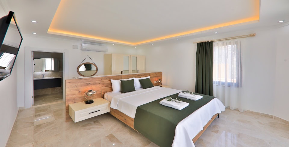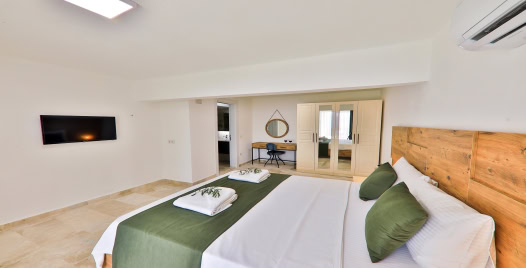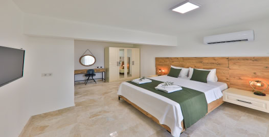 1.Yatak Odası: 1 adet çift kişilik yatak, elbise dolabı, komodin, klima, makyaj masası, Jakuzi, TV, banyo ve lavabo bulunmaktadır.