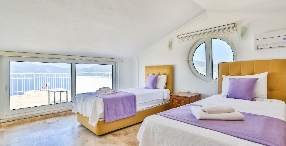 Üst katlarda yer alan 4 yatak odasının ikisi çift kişilik, diğer ikisi ise iki tek kişilik yataklı olarak düzenlenmiştir. Odaların tamamı klimalı olup, modern bir tarzda dekore edilmiştir. Üst kattaki süit odalar geniş balkonlara açılırken, deniz manzaralı teras katı, sabah kahveleri veya akşam gün batımı eşliğinde dinlenmek için ideal bir ortam sunar. Villada toplam 4 banyo ve tuvalet bulunur; bunlardan biri ebeveyn banyosu olarak hizmet vermektedir.