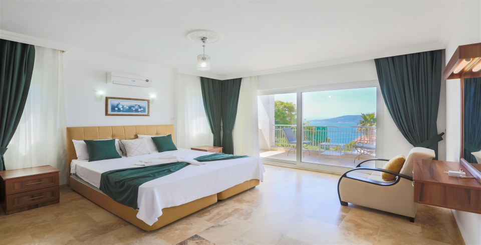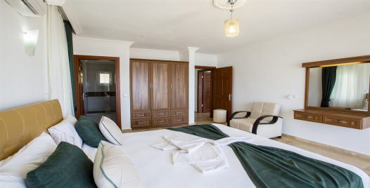 1.Yatak Odası : Çift kişilik yatak, klima, elbise dolabı, komodin, makyaj masası, banyo ve lavabo bulunmaktadır. Deniz manzaralı balkon bulunmaktadır.