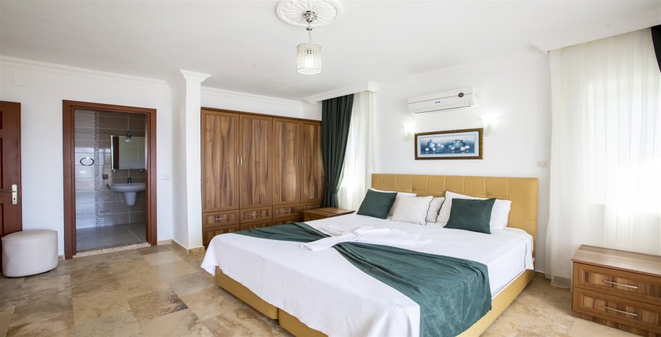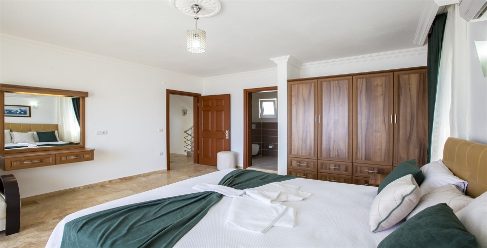 Üst katlarda yer alan dört yatak odasının üçü çift kişilik, biri iki tek kişilik yataklı olarak düzenlenmiştir. Tüm odalar klimalı olup modern bir tasarıma sahiptir. Süit yatak odaları balkonlardan deniz manzarasına açılmakta, üst kattaki çatı terası ise gün batımı manzarası eşliğinde unutulmaz anlara ev sahipliği yapmaktadır. Villada toplam dört banyo bulunur; odalardan bazıları ebeveyn banyosuna sahiptir.