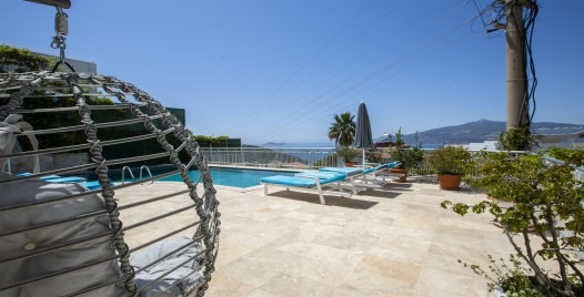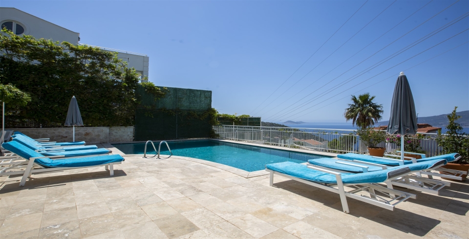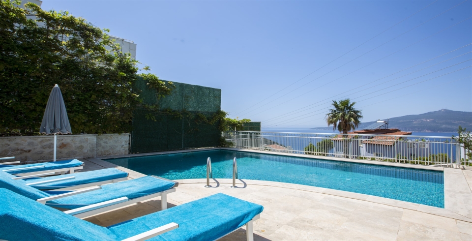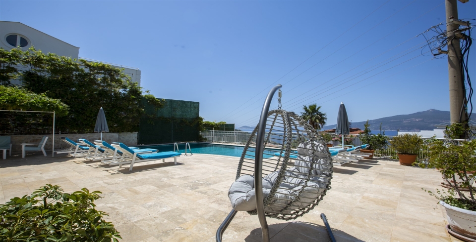 Dış mekânda, yemyeşil bir bahçeyle çevrili özel yüzme havuzu, güneşlenme terası, şezlonglar, barbekü alanı ve oturma grubu yer almaktadır. Bu alan, misafirlere hem eğlenceli hem de huzurlu bir tatil atmosferi sunar. Akşam saatlerinde barbekü keyfi yapabilir, havuz başında deniz manzarası eşliğinde günün yorgunluğunu atabilirsiniz.