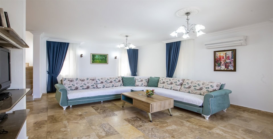 Salon : Deniz manzaralı modern Salona sahip olup TV, uydu, oturma grubu, DVD, internet, klima, WC ve lavabo bulunmaktadır.