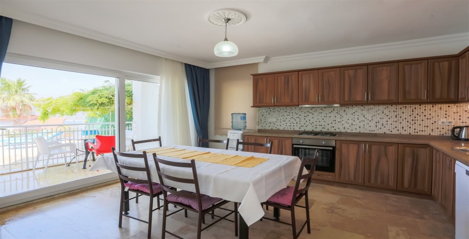 Villanın zemin katında, geniş cam kapılarla havuz terasına açılan ferah bir salon ve tam donanımlı Amerikan mutfak yer alır. Mutfakta fırın, buzdolabı, bulaşık makinesi, mikrodalga, kettle ve tüm mutfak gereçleri bulunur. Oturma alanı modern koltuk takımı, televizyon ve yemek masasıyla donatılmış olup, sevdiklerinizle birlikte keyifli vakit geçirmeniz için konforlu bir ortam sunar.