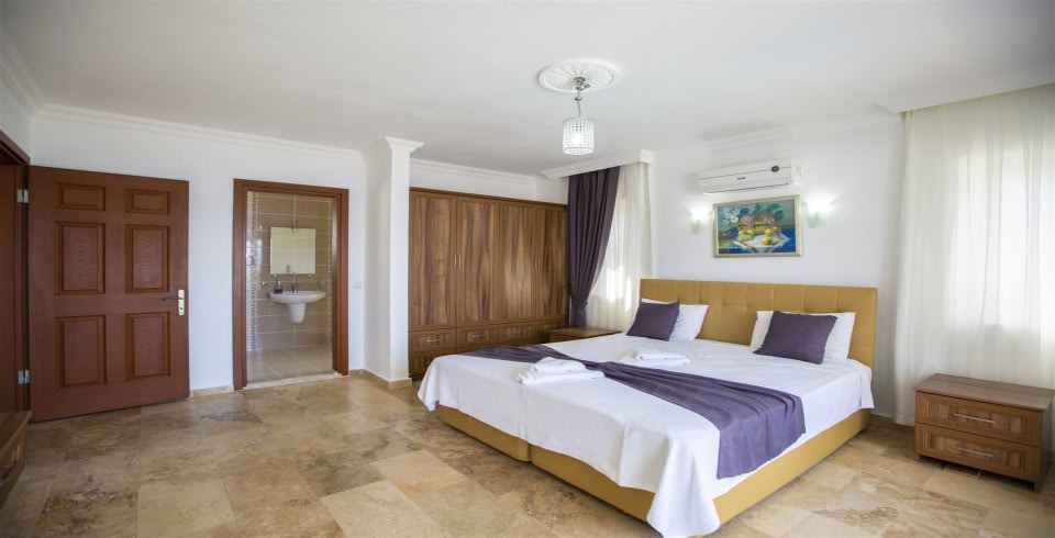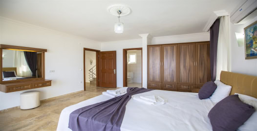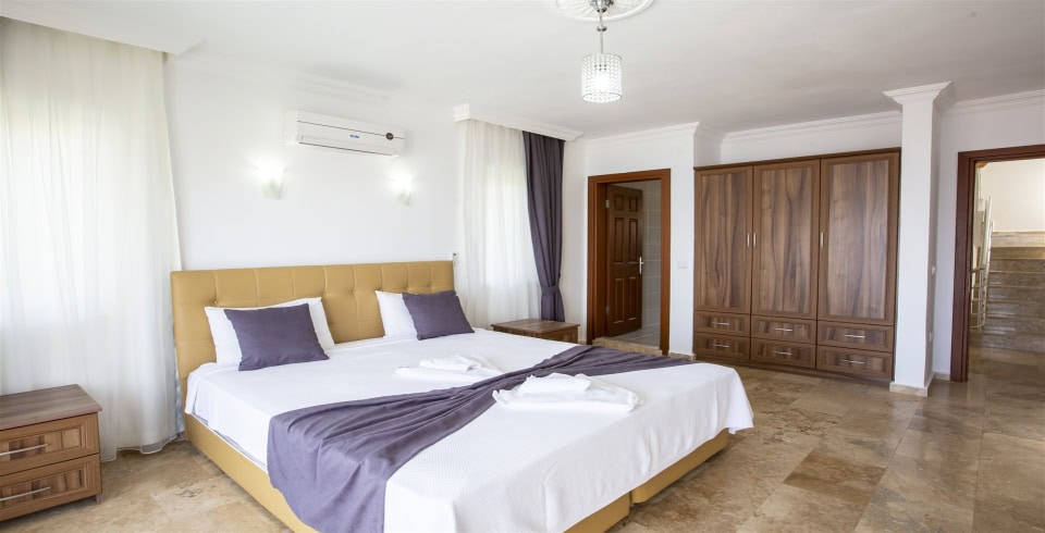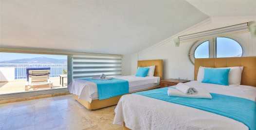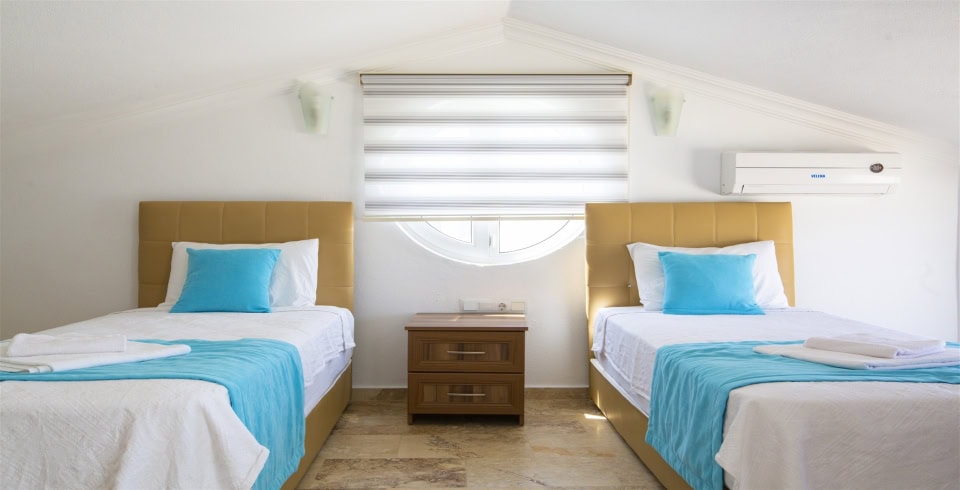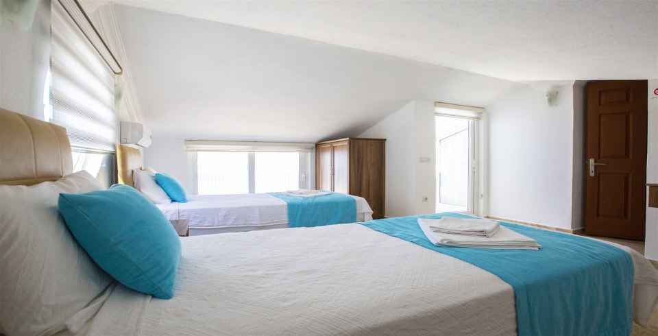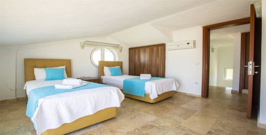 Üst katlarda yer alan yatak odalarının ikisi çift kişilik, diğer ikisi ise iki tek kişilik yataklıdır. Odaların tamamında klima mevcut olup, her biri modern tarzda döşenmiştir. İki süit yatak odası deniz manzaralı balkonlara açılmaktadır. Çatı katında yer alan iki yatak odası ise ortak banyo ve tuvalet kullanımına sahiptir. Tüm detayların özenle düşünüldüğü bu villada, konforlu mobilyalar ve ferah iç mekanlar huzurlu bir tatil geçirmeniz için idealdir.