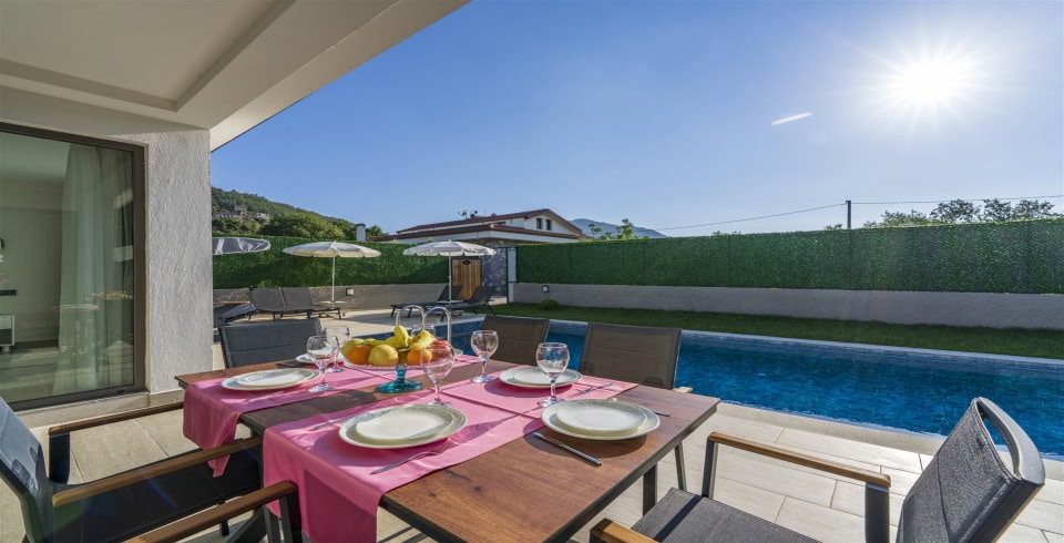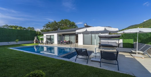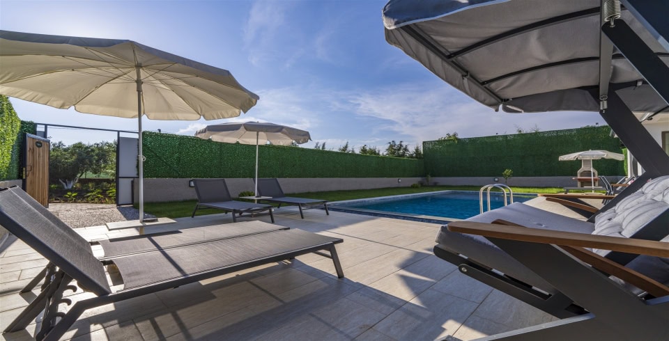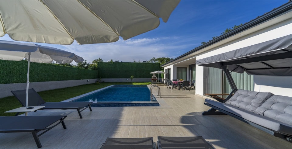 Havuz Ve Bahçe : Villamızın havuzu korunaklı olup dışarıdan gözükmemektedir.Havuz terasında şezlong , şemsiye, oturma grubu ve barbekü bulunmaktadır.