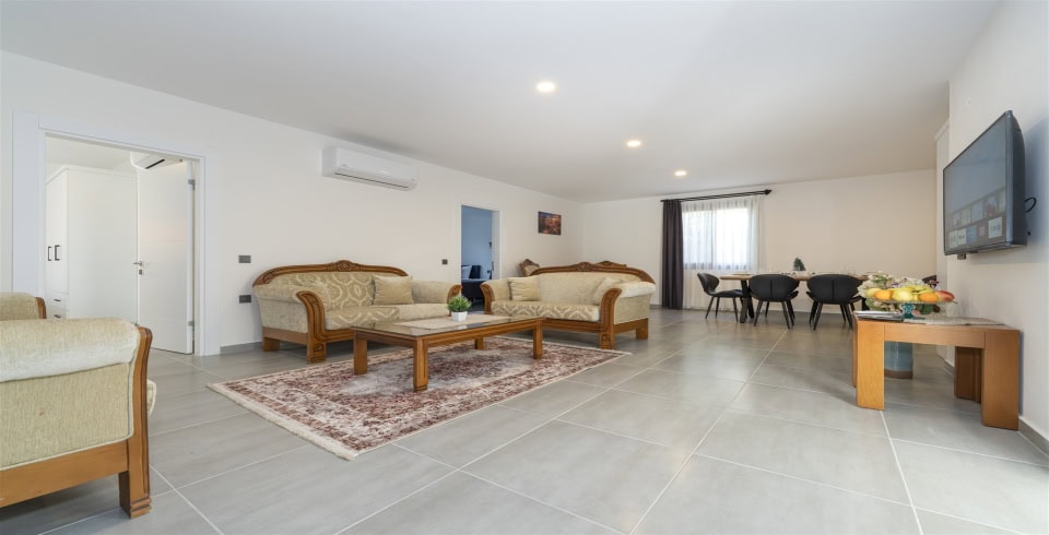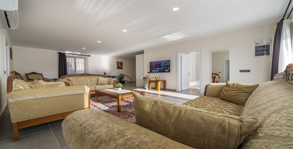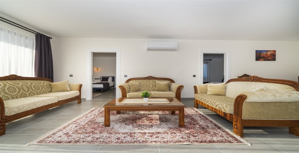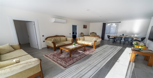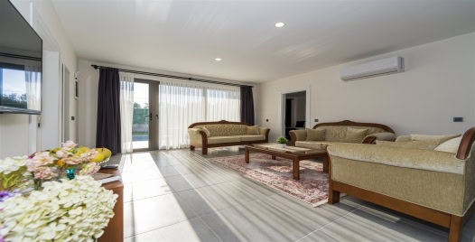 Salon : Villamızın salonu havuz başına çıkışlı olup salonumuzda Oturma grubu, yemek masası , TV, klima bulunmaktadır.