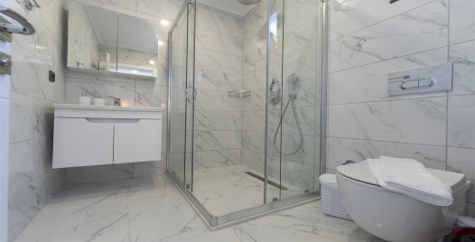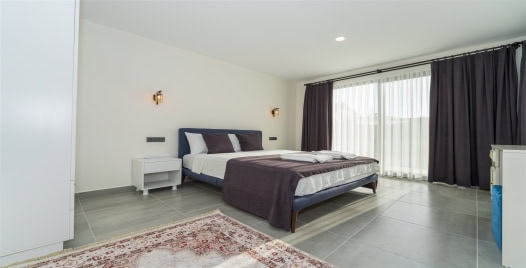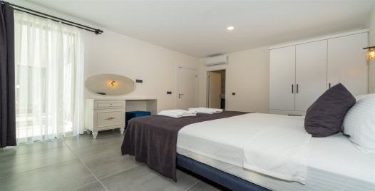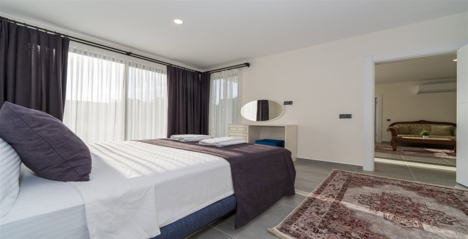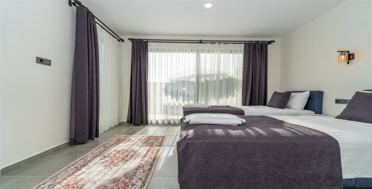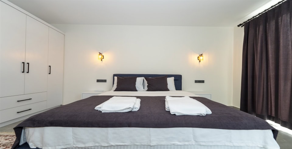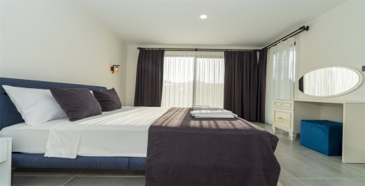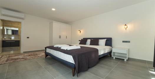 1. Yatak Odası : Çift kişilik yatak, klima, komodin, elbise dolabı, makyaj masası, banyo ve lavabo bulunmaktadır.