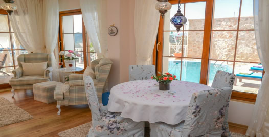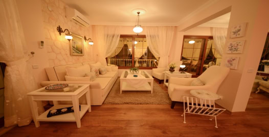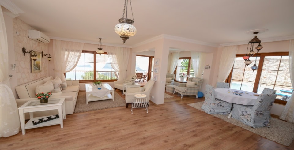 Salon: Deniz manzarası sahip salonda konforunuz için özenle seçilmiş modern ve rahat oturma grubu, 2 adet berjer koltuk, klima, yuvarlak masa ve sandalyeler bulunur. İkinci oturma odasında klima, modern oturma grubu TV, DVD player, uydu alıcı ve internet için Wi-fi bulunmaktadır. Salon içerisinde havuz terasına geçiş bulunur. Bu katta ortak kullanımlı banyo ve tuvalet bulunur.