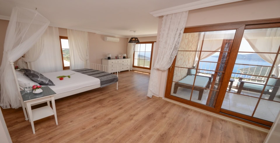 1. Yatak Odası: Deniz manzaralı çift kişilik suit oda klimalı olup içerisinde 1 adet çift kişilik yatak, elbise dolabı, makyaj masası, komodin, banyo ve tuvalet bulunmaktadır. Oda içerisinde balkona çıkış vardır.
