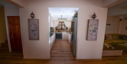 Mutfak: Mutfak havuz katındadır. Tam donanımlı mutfakta buzdolabı, bulaşık makinası, ankastre 4’lü ocak, fırın, mikrodalga fırın, tava ve tencere takımı, elektrikli su ısıtıcısı kettle, ekmek kızartma makinesi, kahve makinesi, yemek takımı, çatal bıçak takımı, su ve çay bardağı takımı yer almaktadır.
