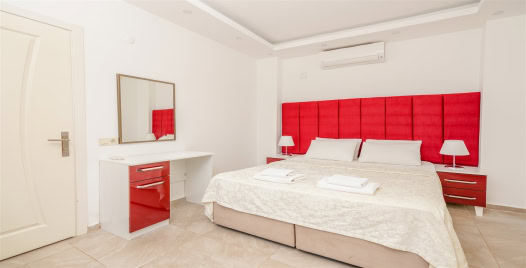 1. Yatak Odası: 1 adet Çift kişilik yatak, klima, jakuzi, komodin, elbise dolabı, makyaj masası, banyo ve tuvalet bulunmaktadır.