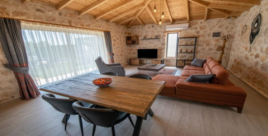 Salon: Villa salonunda konforlu oturma grubu, klima, TV, internet, uydu alıcı, yemek masası, sehpa bulunmaktadır.