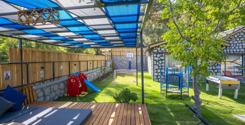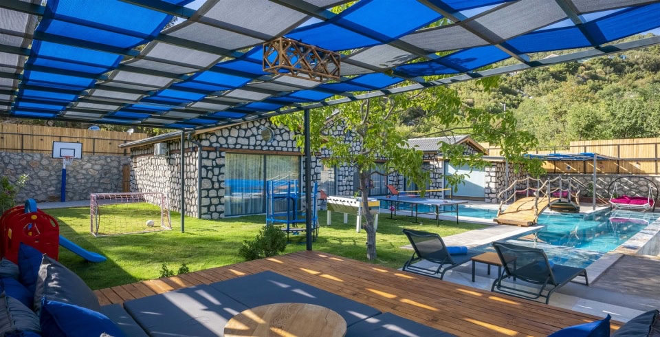 Havuz ve Bahçe:Villa Big Boss geniş bir bahçeye sahiptir. Villamızın havuz terası gayet geniş olup barbekü, dış duş, şezlong, şemsiye, oturma grubu, yemek masası, masa tenisi, salıncak, langırt, yeşillik alanı, mini futbol kalesi, basket sahası, çocuk oyun parkı, köşk ve pergole yer almaktadır.
