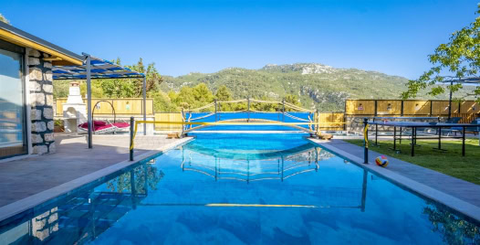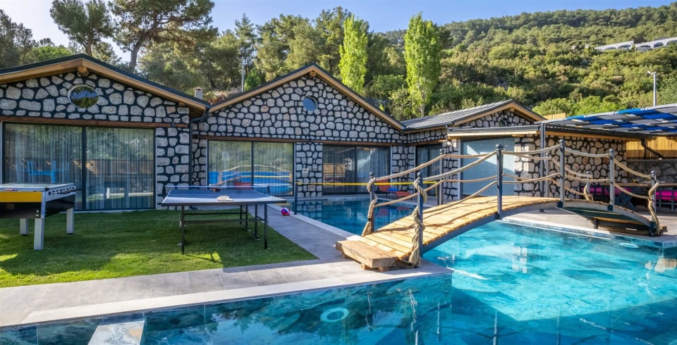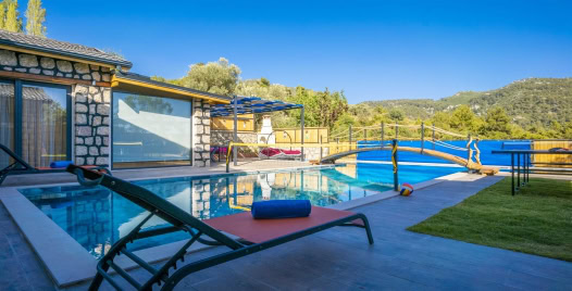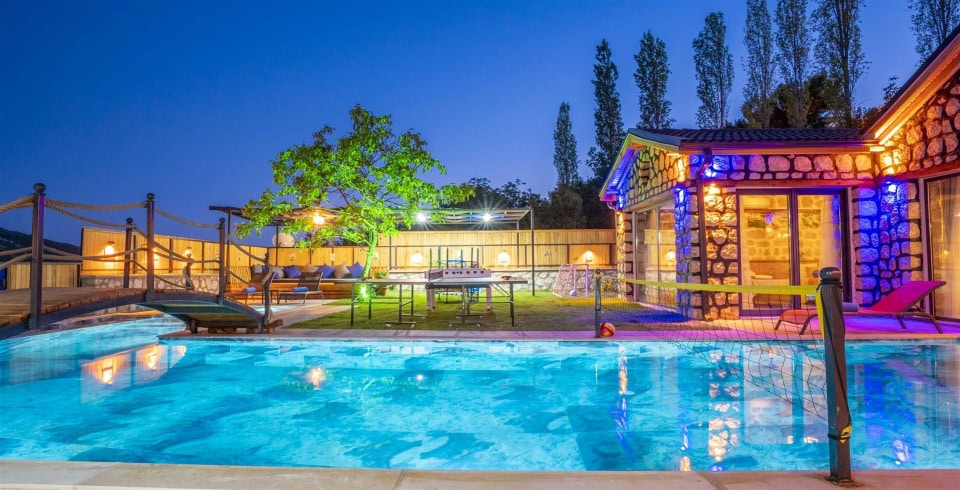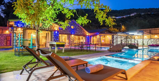 Villa Big Boss, büyük havuzu, havuz içi merdiven, modern oturma grubu, masa tenisi, langırt, eğlenceli ve huzurlu ortam, yeşil bahçe, modern ve lüks iç eşyalar, geniş salon ve mutfak, geniş odaları, oda içi büyük Jakuzili ile unutulmaz bir tatil isteyen balayı çiftleri ve aileler için en çok tercih edilen korunaklı bir Kalkan Balayı Kiralık Villamızdır.