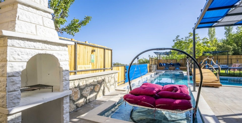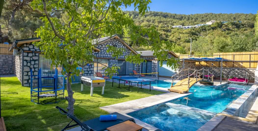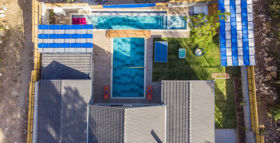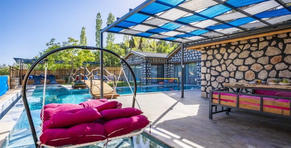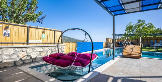 Villa big boss havuz terası çok geniş olup, köşk, çim alanı, 4 şenzlong, yemek masası, havuz köprüsü gibi mükemmel özelliklere sahip olması ile mükemmel bir ailecek tatil geçirebilirsiniz.