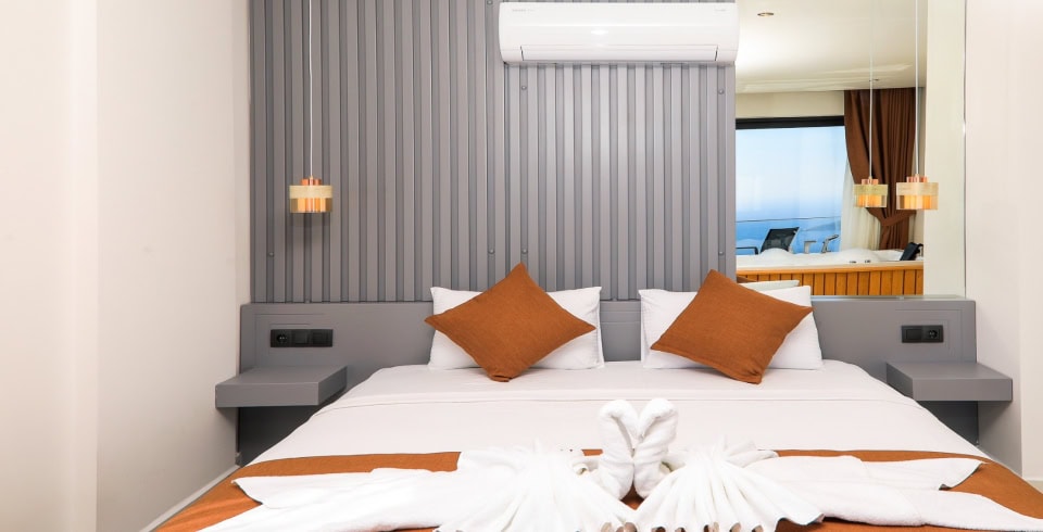 1. Yatak Odası : 1 adet çift kişilik yatak, klima, komodin, elbise dolabı, makyaj masası, balkon, banyo ve tuvalet, jakuzi, saç kurutma makinası bulunmaktadır.