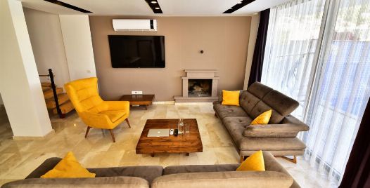 Salon : Salonumuzda oturma grubu, klima, LCD TV, sehpa, uydu alıcı bulunmaktadır. Havuz terasına çıkış yapılabilmektedir.