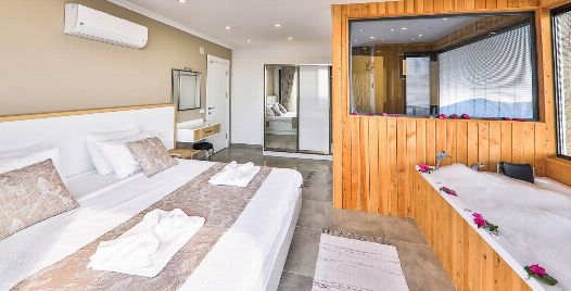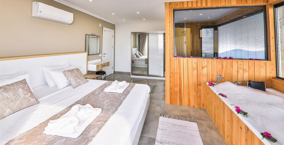 1. Yatak Odası : Süit oda, İki kişilik yatakla beraber sizleri sıcak yaz günlerinde serin tutması için bakımları yapılmış klima ile komodin eşyalarınız için geniş elbise dolabı, makyaj masası, jakuzi, banyo ve lavabodan oluşmaktadır.