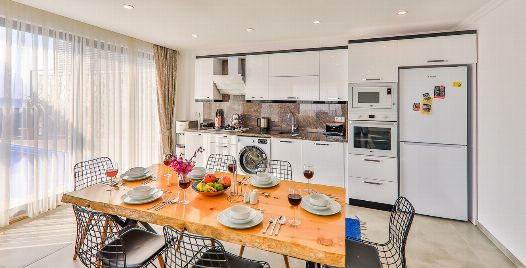 Mutfak : Villamızın geniş Amerikan mutfağı ile sizlere kendi evinizin mutfağı gibi hissettirecek. Deniz ve eşsiz doğa manzarası ile sizleri büyüleyecektir. Ayrıca mutfakta bulaşık makinası, buzdolabı, çamaşır makinası, ekmek kızartma, su ısıtıcısı, fırın, 4`lü ocak seti ve 6 kişilik geniş yemek masası ile mutfak araç gereçlerini kullanma fırsatını sizlere sunuyoruz.