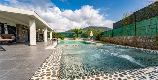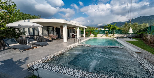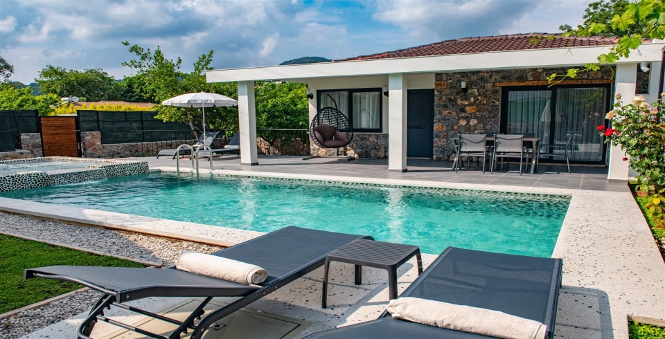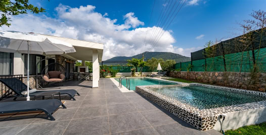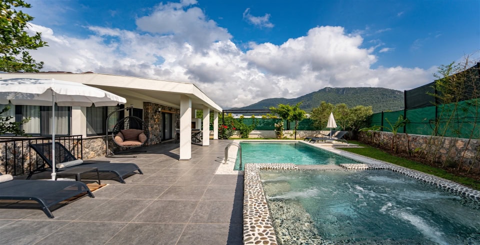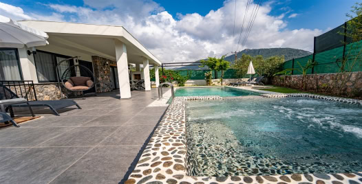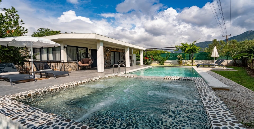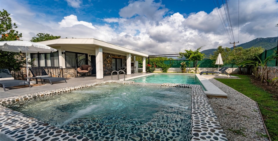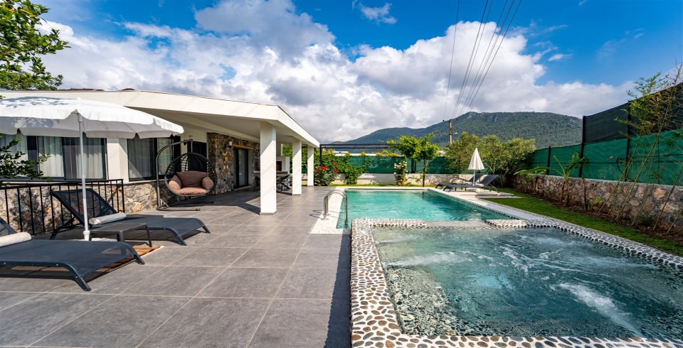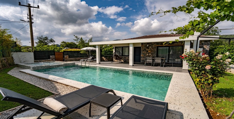 Havuz ve Bahçe : Çam ağaçları arasında, havuz terasında jakuzi, salıncak, şemsiye, bahçe mobilyası, şezlong, mangal ve yemek masası bulunmaktadır.