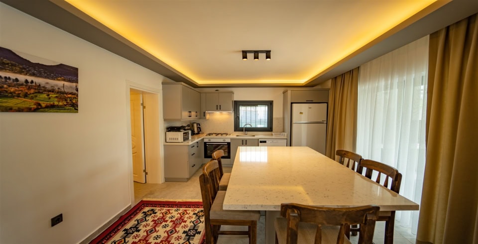 Mutfak : Buzdolabı, çamaşır makinesi, bulaşık makinesi fırın, mikrodalga fırın, 4’lü ocak, su ısıtıcı (kettle), tost makinesi, yemek masası ve 4 kişi için mutfak takımı bulunmaktadır.