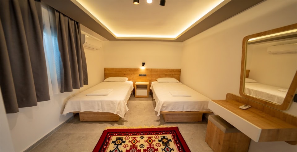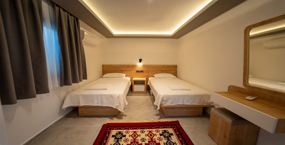 2. Yatak Odası : 2 adet tek kişilik yatak, klima, komodin, elbise dolabı, TV balkon, banyo ve lavabo bulunmaktadır.