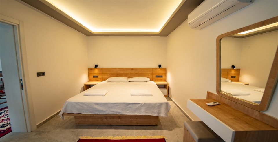 1. Yatak Odası : Çift kişilik süit yatak, klima, komodin, makyaj masası, TV, elbise dolabı, balkon, banyo ve lavabo bulunmaktadır.