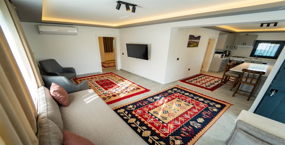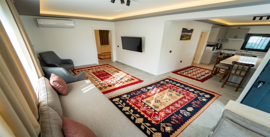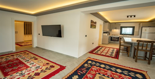 Salon : Oturma grubu, sehpa, televizyon (Smart TV), uydu alıcısı, klima, internet, terasa çıkış bulunmaktadır.