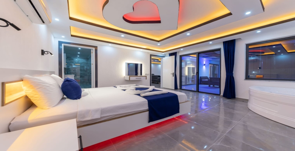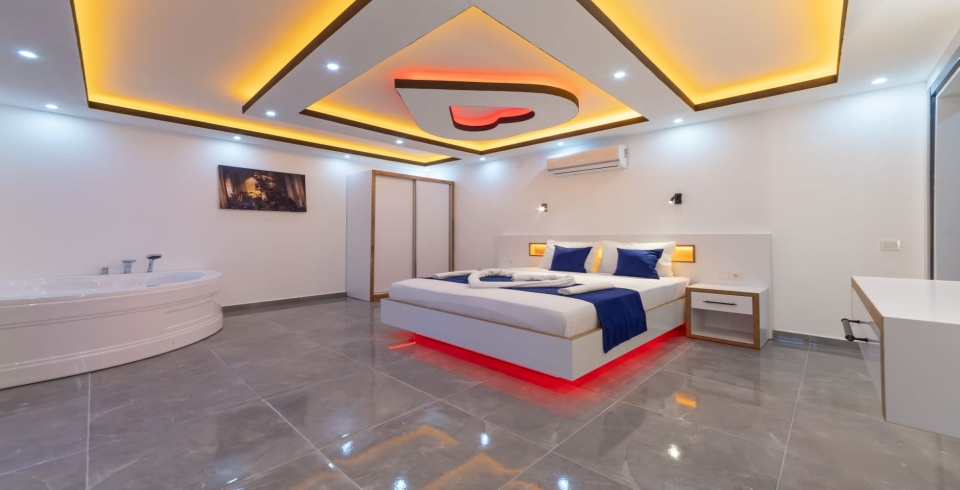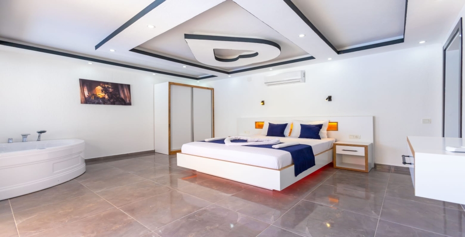 1. Yatak Odası : Çift kişilik yatak, klima, komodin, jakuzi, TV, makyaj masası, banyo ve lavabo bulunmaktadır.
